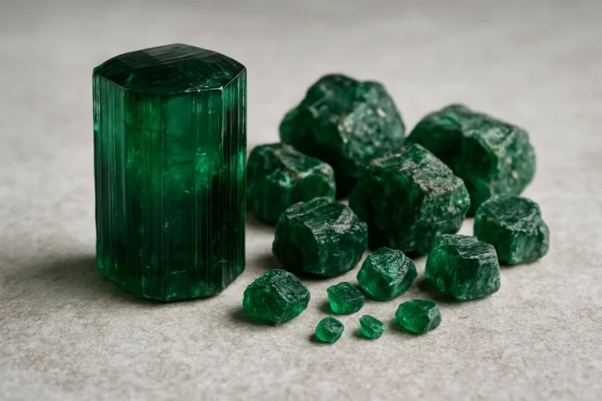 A legfinomabb minőségű példányok átlátszóak vagy félig átlátszóak, míg a gyógyító célokra használt darabok gyakran opákabbak. A természetes kristályok gyakran mutatnak zónásságot, ami azt jelenti, hogy különböző árnyalatú zöld sávok váltakoznak bennük, ez különösen értékessé teszi őket a gyűjtők szemében.
