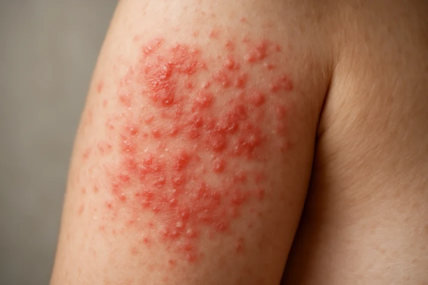🌟 Kontakt dermatitis: Éles határokkal rendelkező, vörös területek
